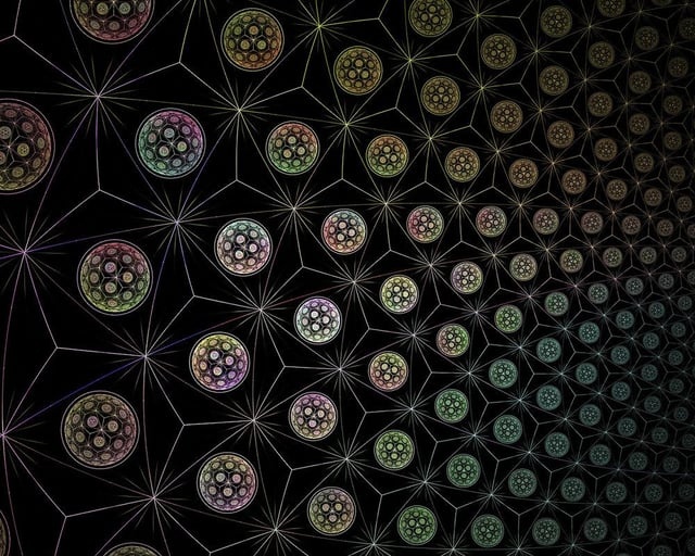 64テトラヒドロングリッドは、ベクトル平衡体をフラクタルに展開した結果として現れる、多数のテトラヒドロン(神聖幾何学における正四面体)の集合として解釈されます。