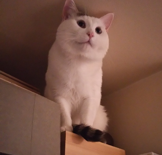 食器棚の上でそびえるのが好き。でも1人でなかなか降りられない。