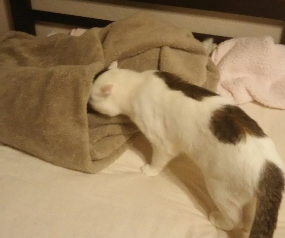 穴の中、何かあるかな〜?この後、ズサッと毛布に滑り込む。毛布捲って姿を露わにすると、「ええ〜?」みたいな顔。