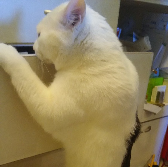 おやつの引き出しも自分で開けちゃう。帰宅して散乱した色々に絶望することもしばしば。筋肉モリッとしてるね…